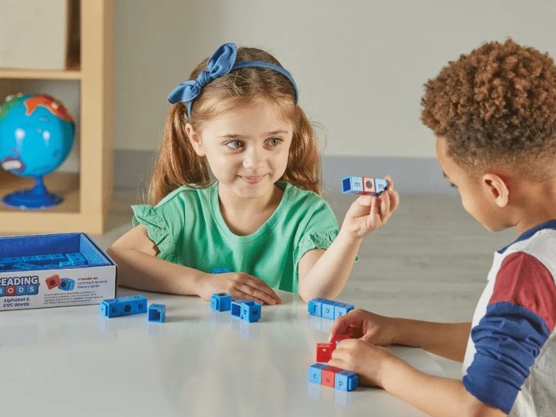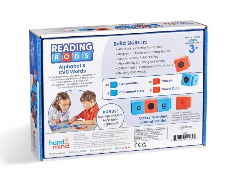 Alphabet et mots CVC – Reading Rods® de Hand2Mind est un outil pédagogique conçu pour aider les enfants à développer leurs habiletés en lecture et en phonétique grâce à la manipulation concrète. En assemblant les tiges, les jeunes apprenants explorent la reconnaissance des lettres, l’isolement des sons et la construction de mots CVC (consonne-voyelle-consonne).