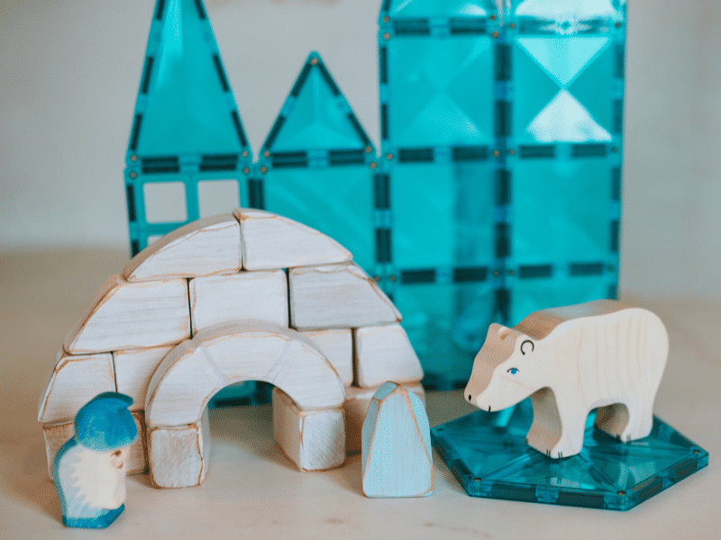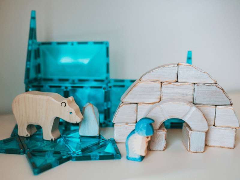 Les enfants pourront bâtir, déconstruire et réinventer leur paysage polaire tout en développant leur motricité fine, leur créativité et leur pensée spatiale. Les jeux symboliques prennent vie à travers des histoires inspirées du Grand Nord, favorisant également le langage et la collaboration.