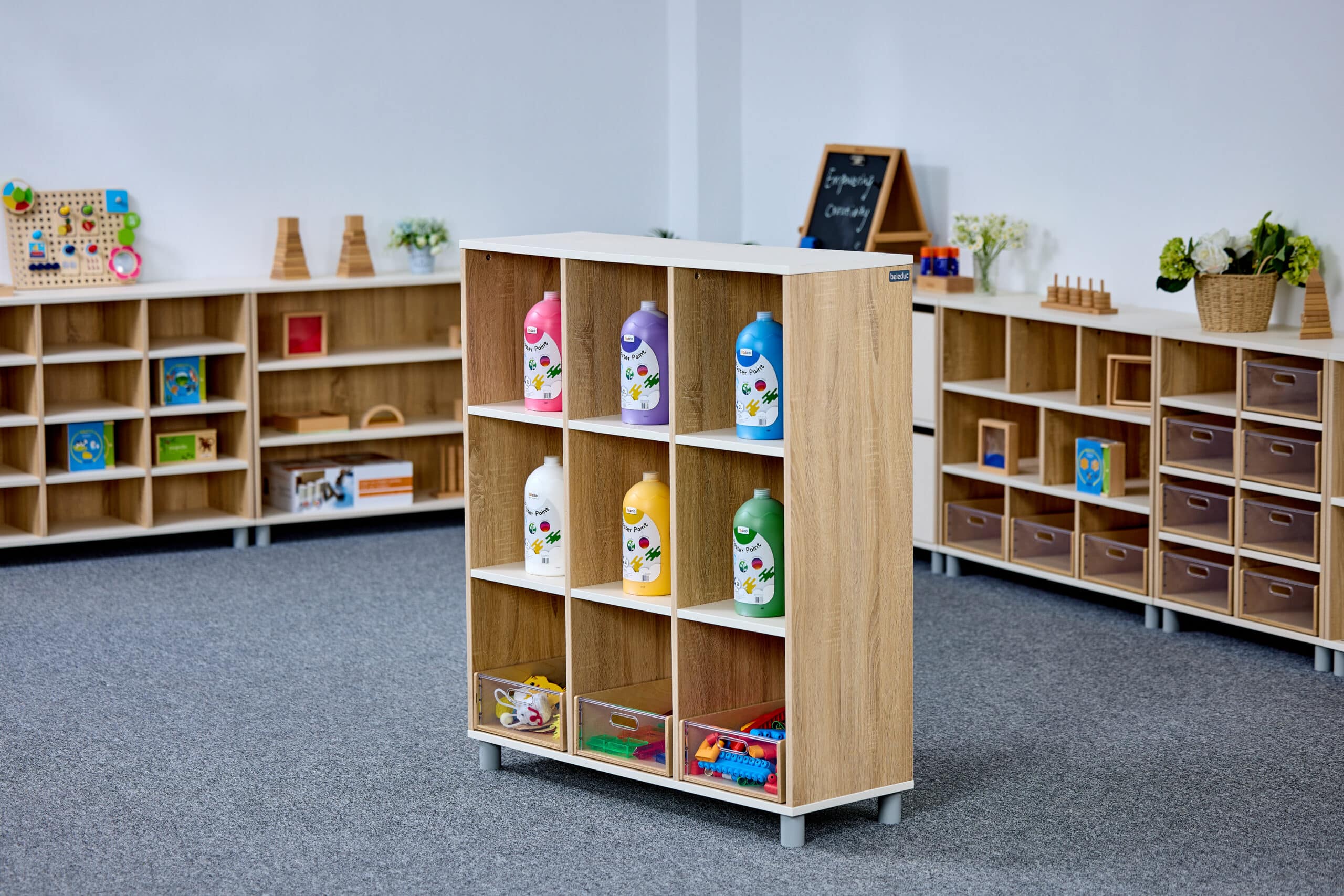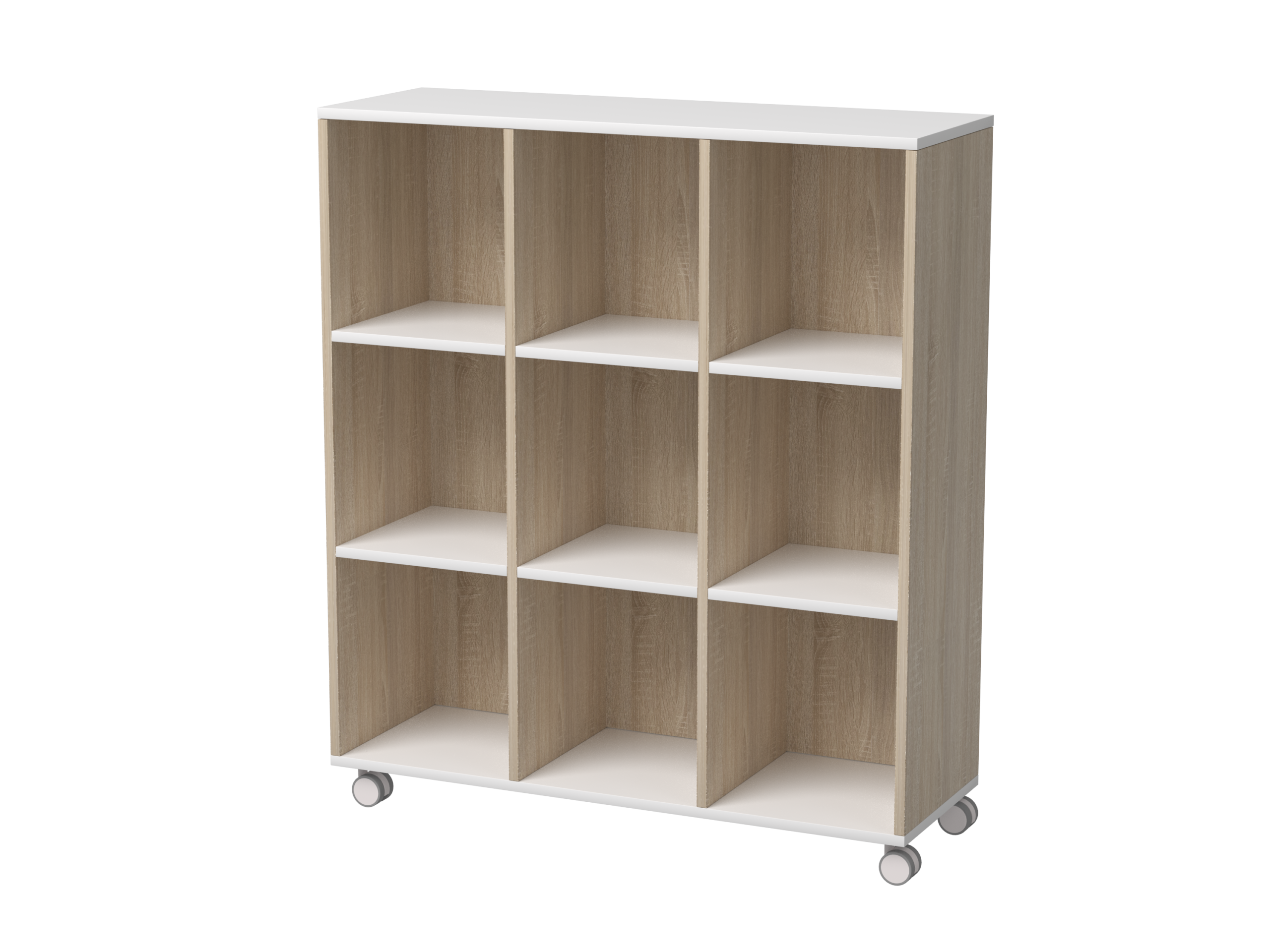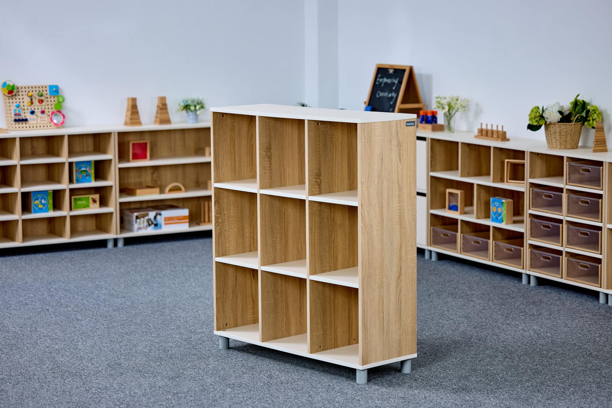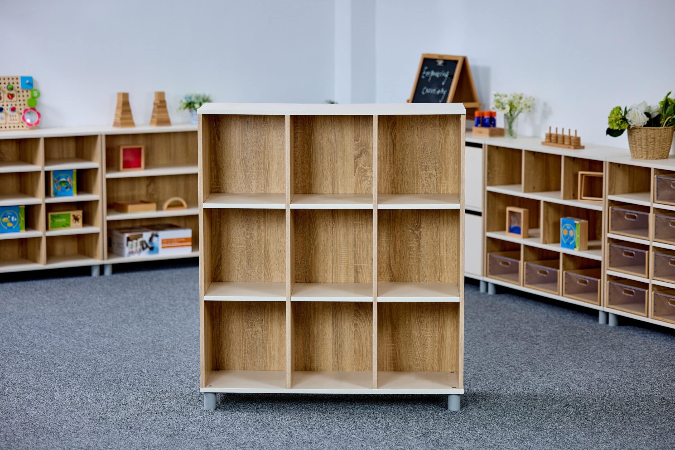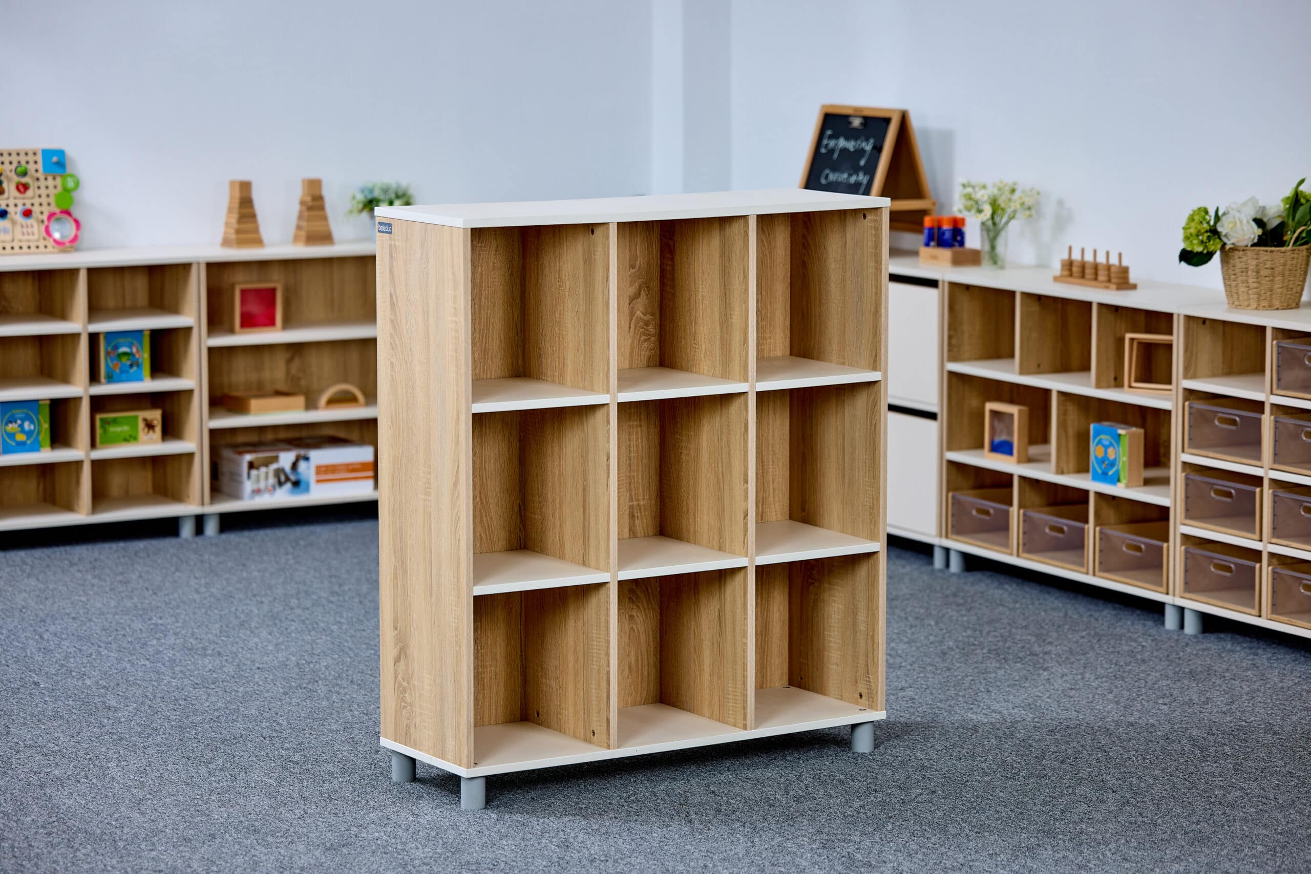 Meuble de rangement ouvert à 9 compartiments et 3 étages idéal pour les CPE, les garderies et les écoles. Ce meuble est pensé pour inviter les enfants à explorer, jouer et ranger leur matériel en toute autonomie.