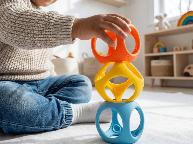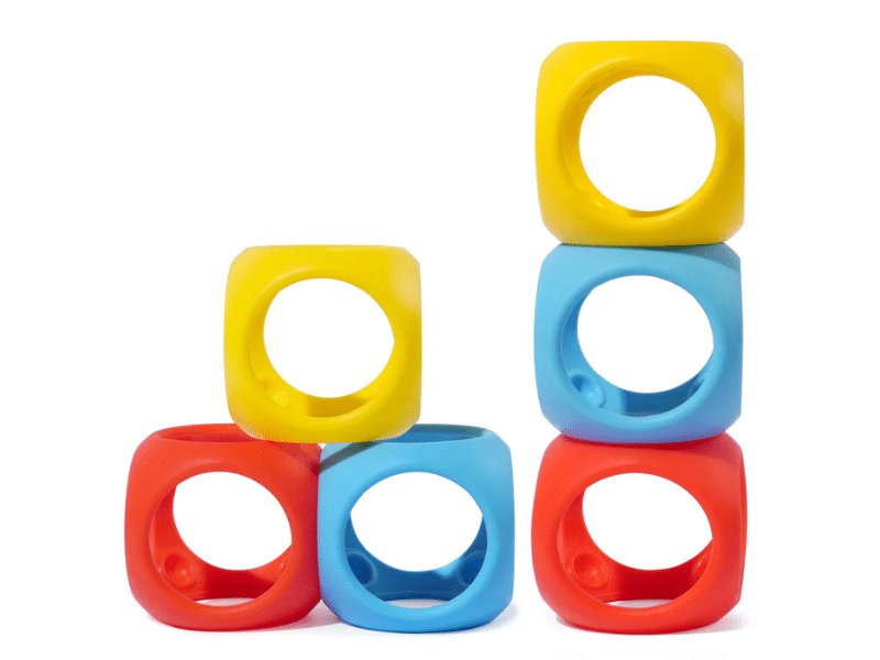 - Stimule motricité et coordination : manipulation, empilement et exploration tactile